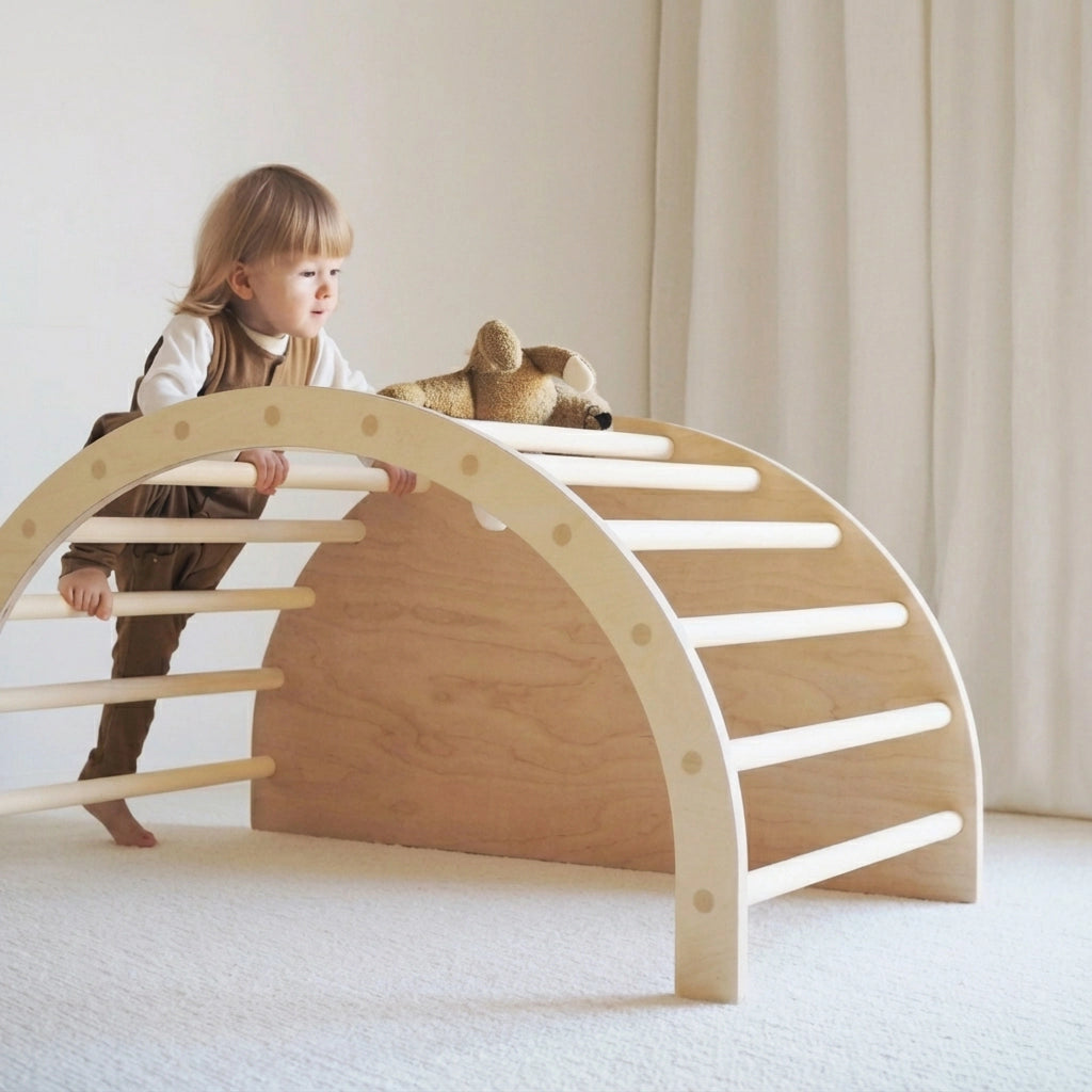 Turn it over to create a climbing arch and bridge for active play. Kids can crawl under, climb over and invent obstacle courses, building balance and confidence while the same piece later works as a small desk or toy corral.